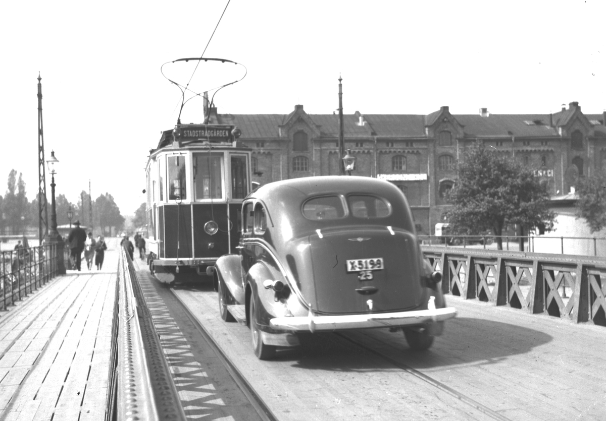 Trafik på svängbron. En 1938 Dodge D8, droskägare Rudolf Forsell i Gävle.