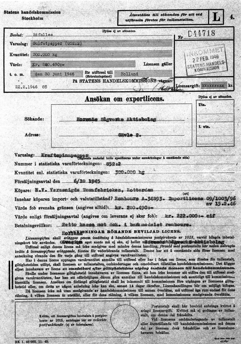 Ansökan av exportlicens, Korsnäsverken, 1946.