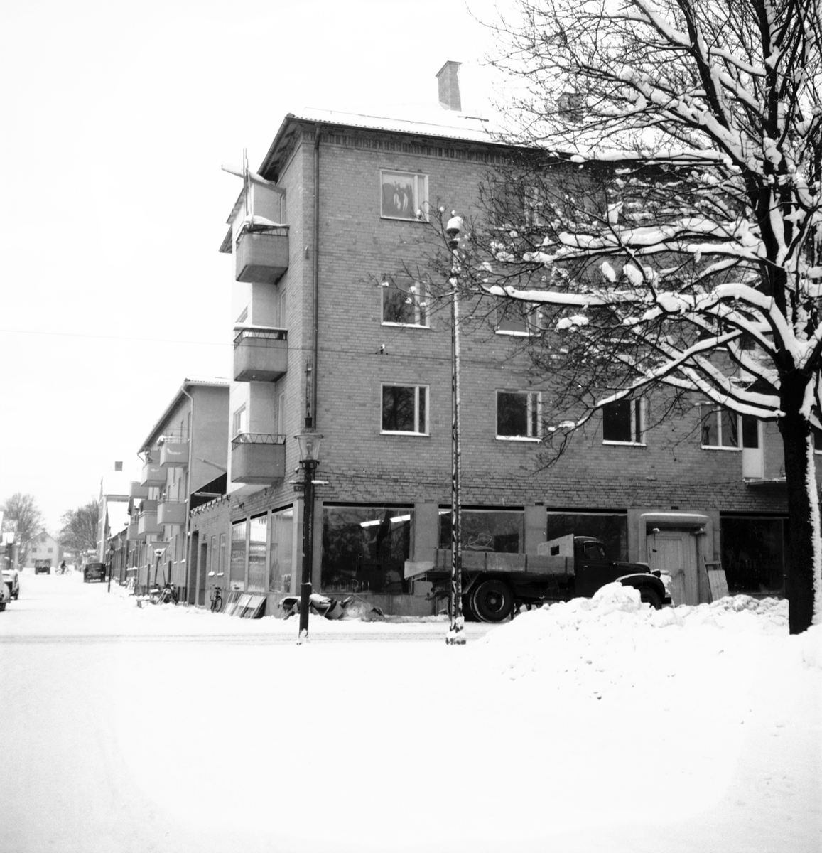 Systembolagets nya butik vid Södra Kungsgatan. 30 december 1950. Systembolaget låg i hörnet Södra Kungsgatan och Åkargatan (som idag heter Övre Åkargatan) entrén var från Åkargatan.
