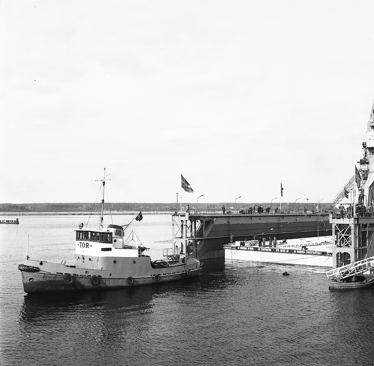 Den 21 april 1961. Gävle Varv. Regalskeppet "Wasas" kassuns avfärd. Bogserbåten "Tor".