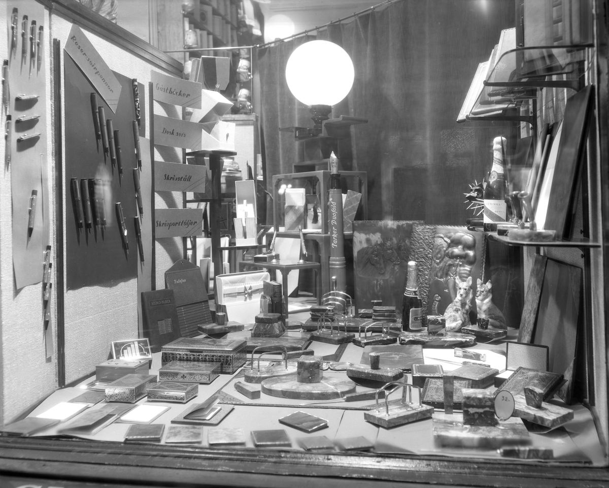Hedmans Bokhandel. Skyltfönstertemat är "Skyltfönster med diverse varor"