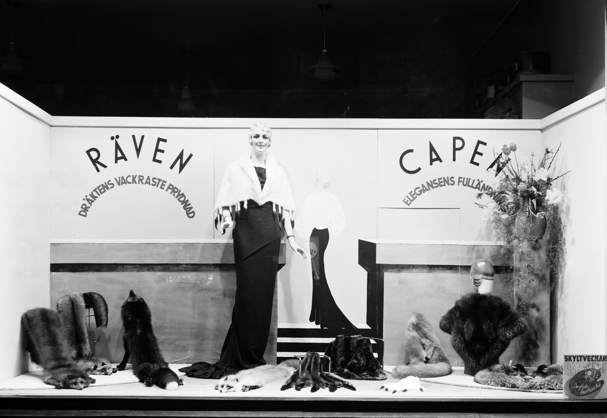 De glada fönstrens fest. Skyltveckan. 1937. Pälsaffär. "Räven. Dräktens vackraste prydnad. Capen. Elegansens fulländning".