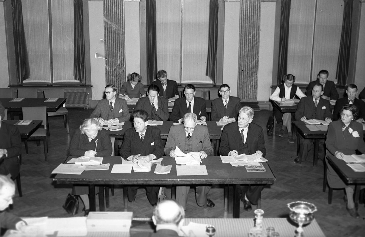 Stadsfullmäktige. 1948. Första sammanträdet i nya lokaler i stadshuset. Reportage för olika tidningar.
