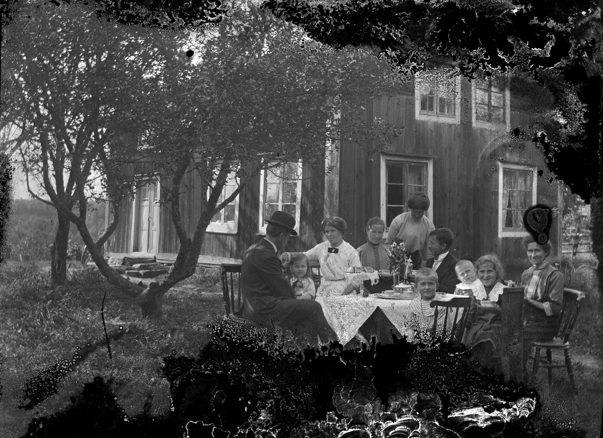 Gamla gården "Erik-Daniels". Anna Stina och Sofia var systrar. Lars Gustav, Karl-Erik och Andrea var syskon, Lars Gustav bor i stugan. Från vänster Lars Gustav Åsberg f. 28 juli 1880 d. 28 november 1960, dotter Margit f. 1 maj 1909, hustru Olga Charlotta Blomberg-Åsberg f. 4 december 1888 d. 9 mars 1929, Anna Stina Englén-Blomberg, mor till Olga, f. 1 augusti 1864 d. 29 april 1925, Karl Erik Åsberg f. 3 augusti 1876 d. 21 mars 1915. På stolen i mitten sonen Joel f. 27 december 1905, därefter sonen Ivar f. 29 mars 1909, dotter Valborg f. 9 september 1901, Sofia Englén-Åsberg f. 29 mars 1874. Stående Andrea Åsberg f. 10 januari 1884 d. 29 juli 1914.