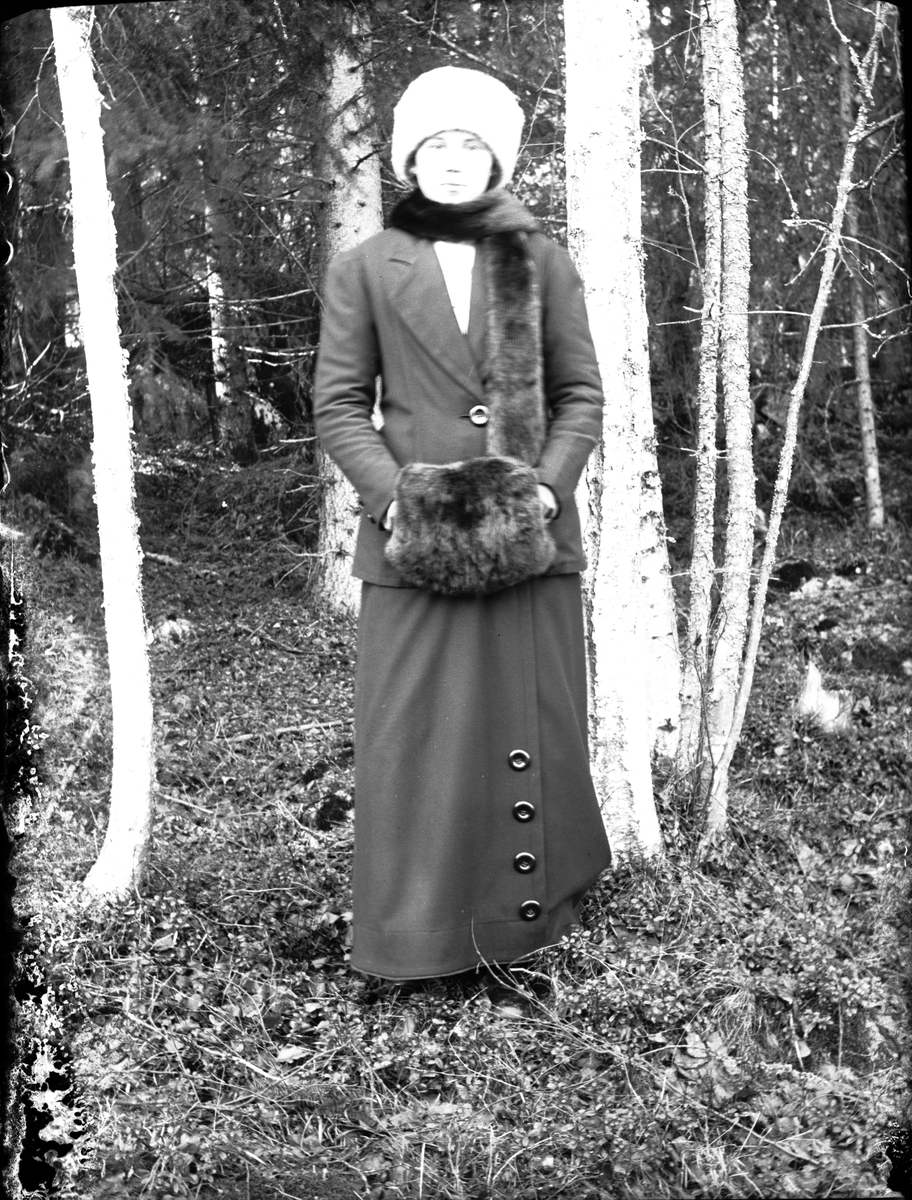 En kvinna står i skogen, klädd i dräkt, skinnmössa, halsduk och muff.