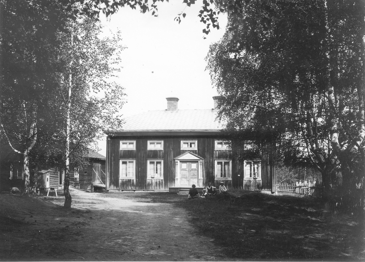 Berggården, fotografens hem i Östansjö. Personerna som sitter framför bron är från vänster Ester Lindberg med dottern Majly, Elvira Lindberg med sonen Folke samt Per H Lindberg. Ester, Elvira och Per är barn till Per Lindberg.