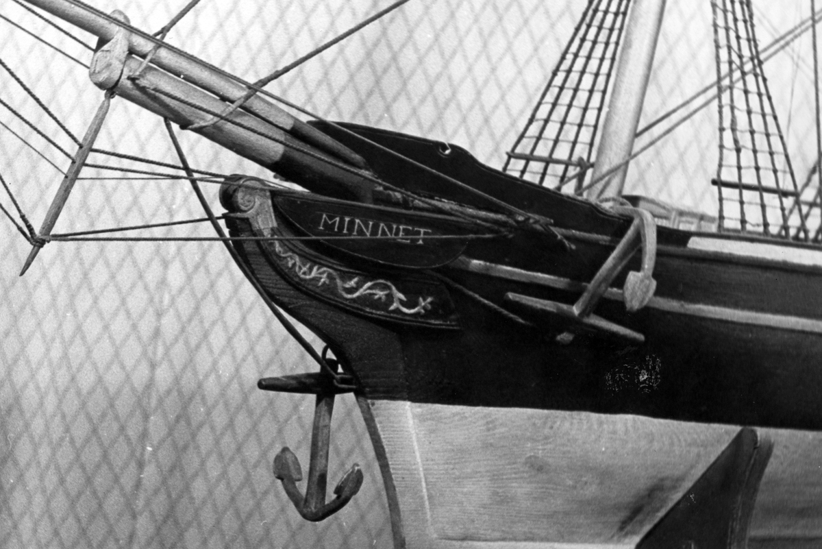 Modell av skeppet "Minnet". Skepp byggt av Gefle 1836, 249 sv. 143 nyläst, 493 ton. Redare: D. Elfstrand o Co Gefle.