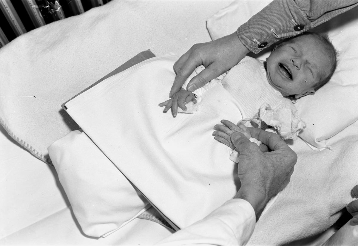 Titel: Lasarettet doktor Corallus, gynekolog. Baby med tre tummar, 26 oktober 1948.