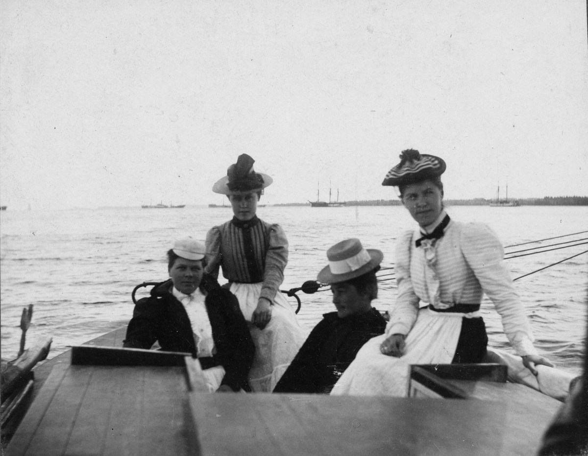 Här är man ute på Gävlefjärden. Till vänster i mörk jacka sitter Elna Brundins halvsyster Elisabet (Lisa) Olsson.