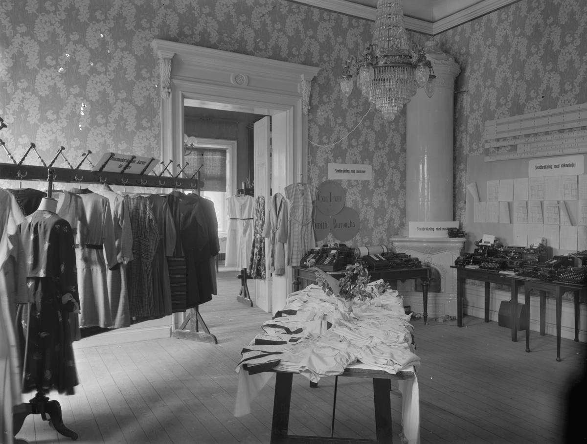 Yrkesskolans utställning i Stadshuset. Husmodersskolans kurser för äldre. Snabbräkning med maskiner. Snabbräkning med räknelinjal