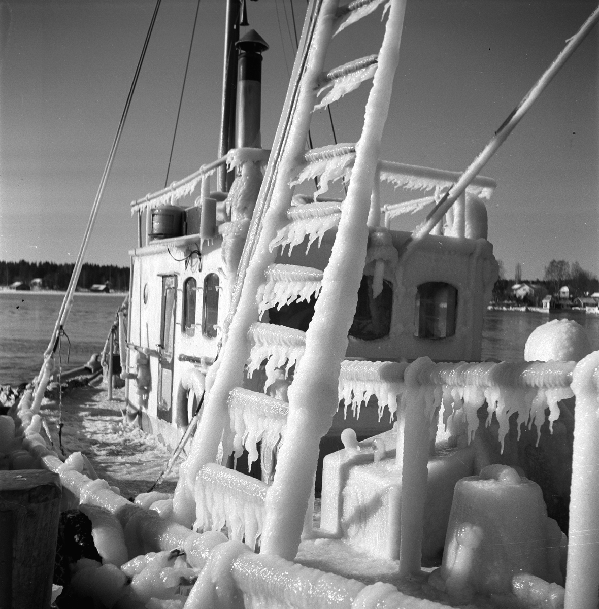 Titel: "Stellar" fartyget som gått på grund, på väg till Gävle hamn. April 1949.