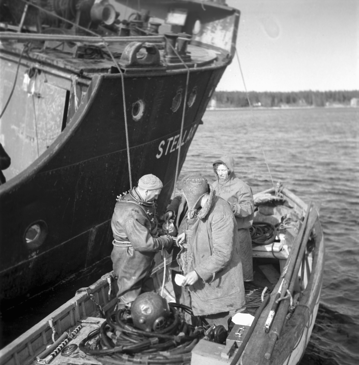 Titel: "Stellar" fartyget som gått på grund, på väg till Gävle hamn. April 1949.
