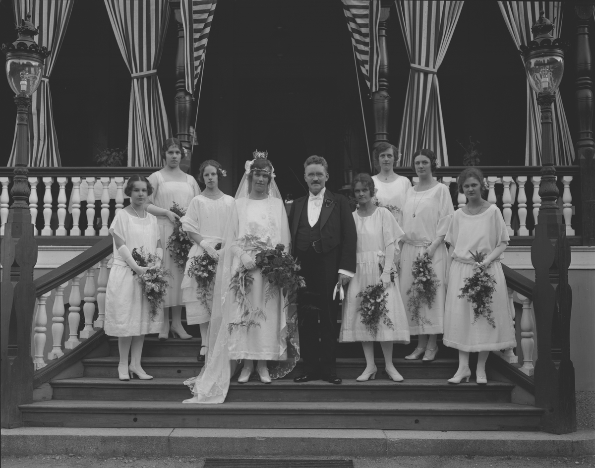 Brudparet Bergstrands med brudtärnor på trappan till Strömdalens värdshus