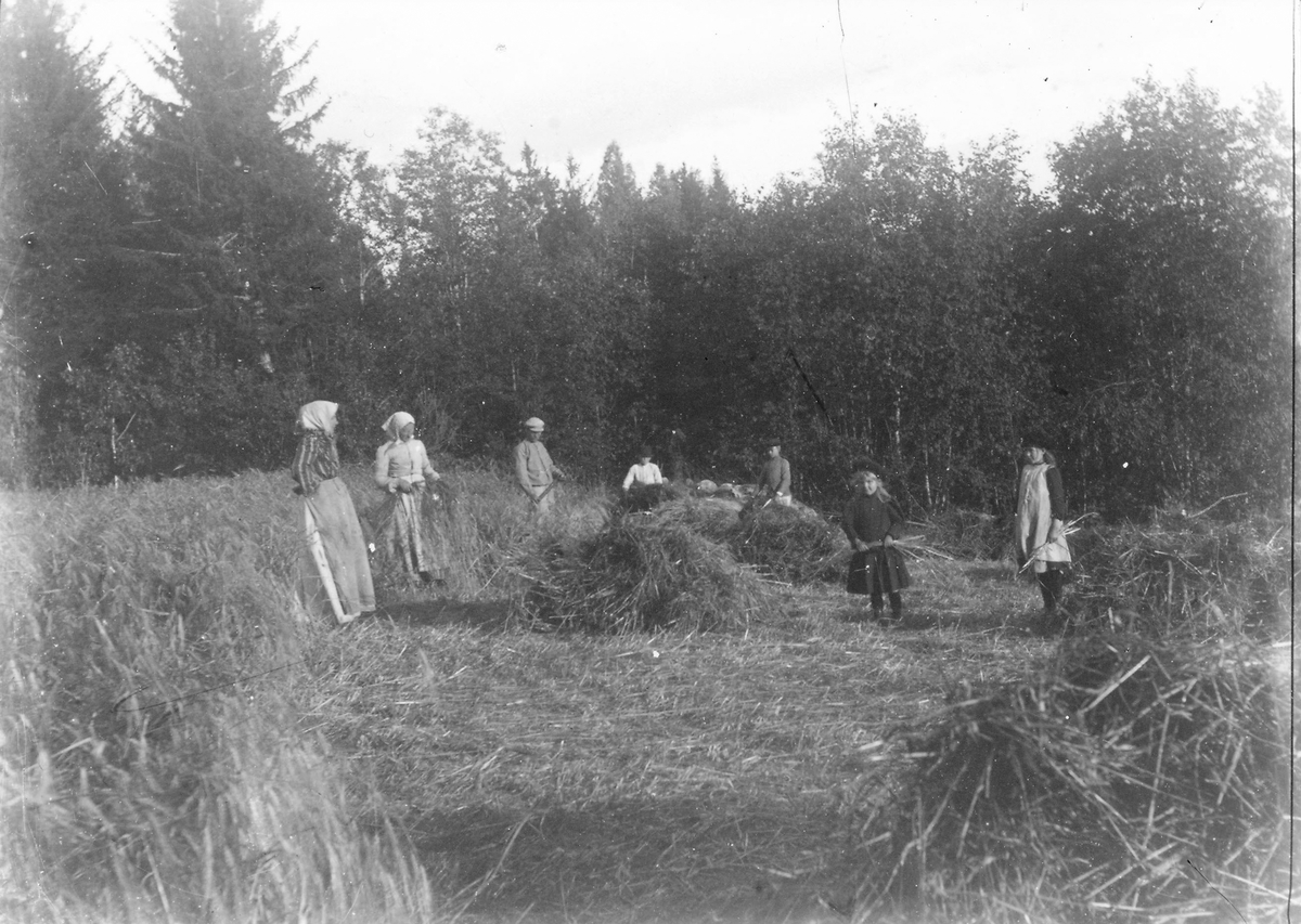 Personerna från vänster: Anna Lindberg, tre okända personer, Per Herman Lindberg, Elvira och Ester Lindberg.