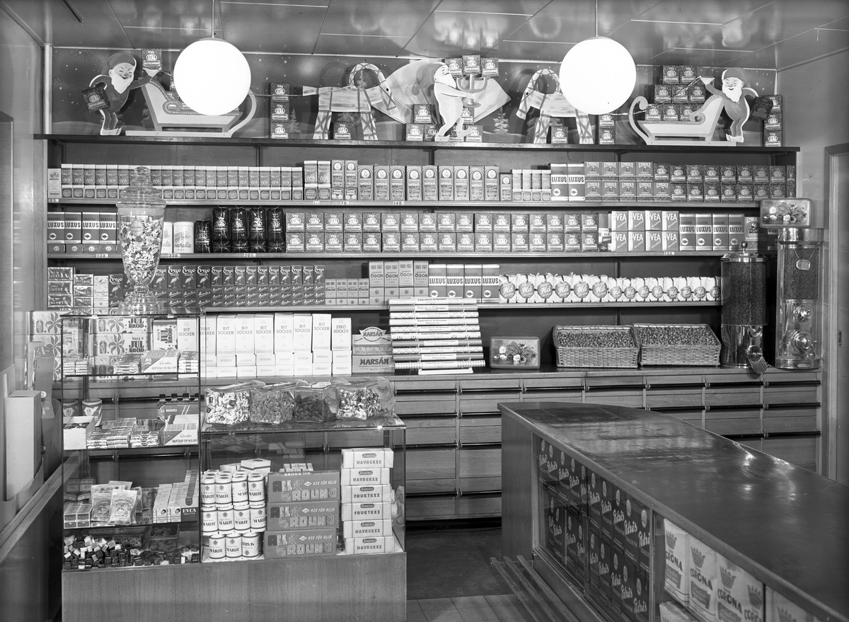 Interiör från Holmströms Speceriaffär, Brynäsgatan 26, Gävle. 9 januari 1946. Fotograferat för ICA.