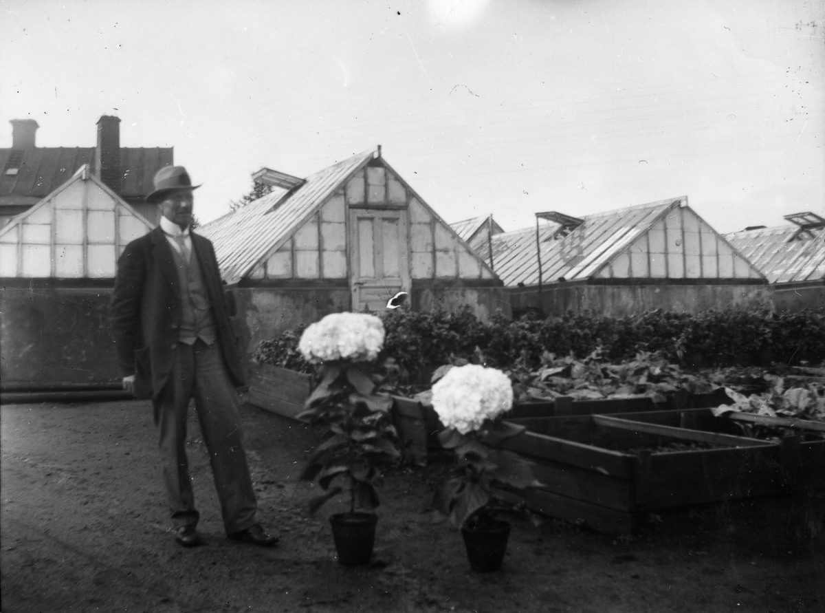 Man poserande med jättelika krukväxter, i bakgrunden växthus.