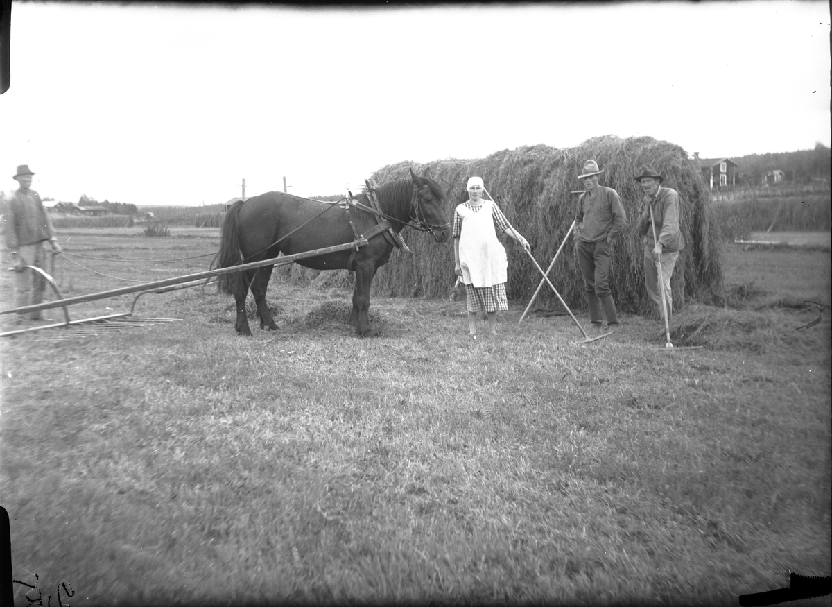 Slåtter. Till höger om hästen; Ida, Salomon och Johan Åberg, Balka, Mossbo.