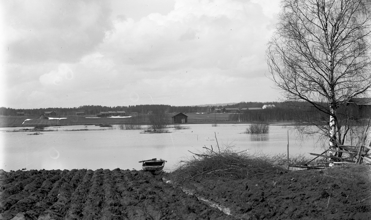 Översvämning i Hästboån. Gamla smedjan i mitten och till höger Tjernelds. Den 25 september 1927.