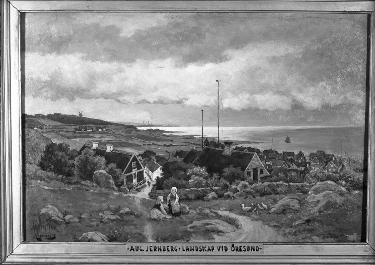 Tavla "Landskap vid Öresund" av Jernberg. Länsutställning av Konstföreningen i Gävle. November 1945. Tavlor tagna på museet i Gävle.