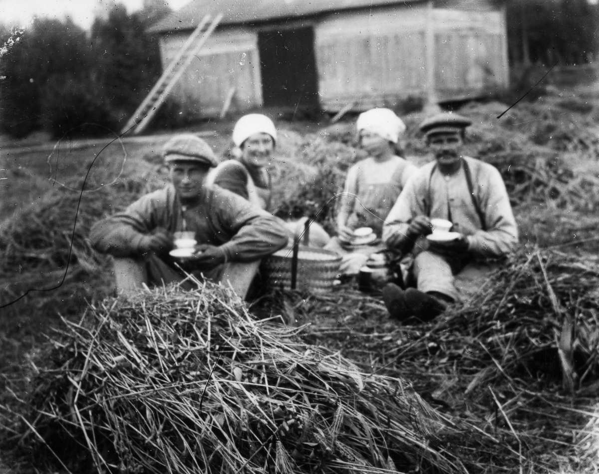 Två män och två kvinnor under en kaffepaus i slåttern.