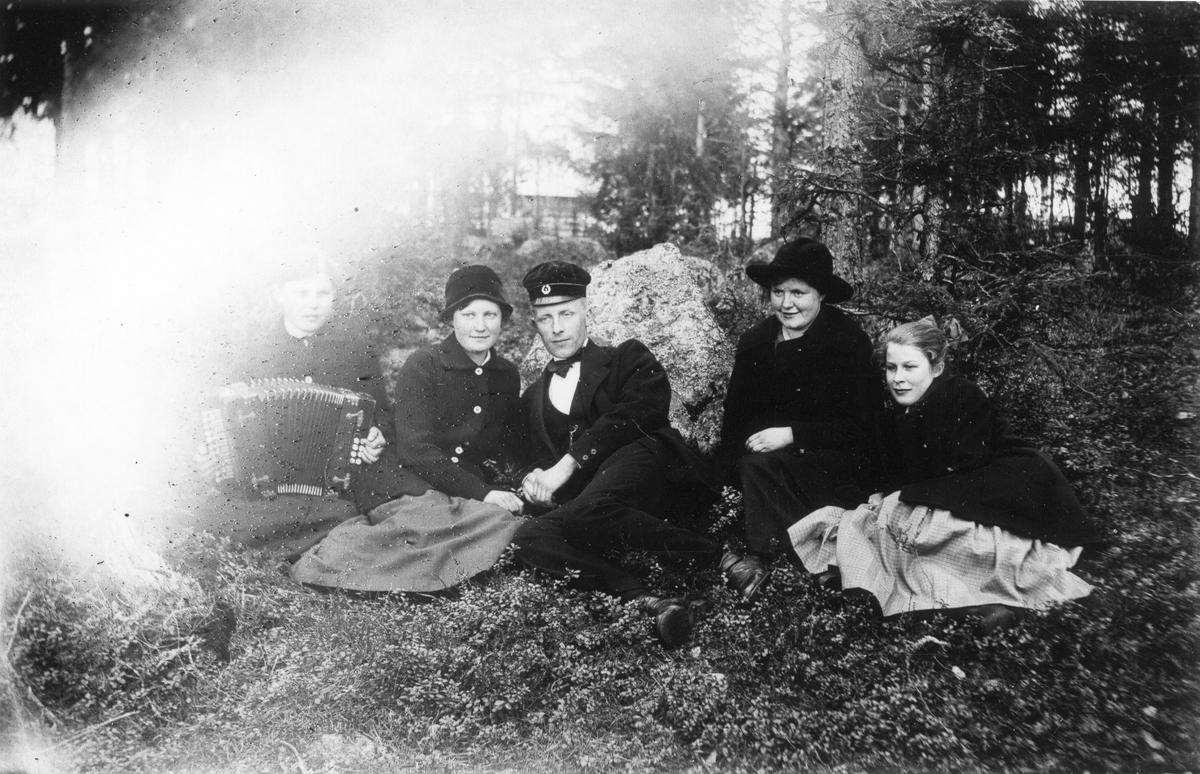 Från vänster: Karin Jonsson (Sven-Jons), Sara Ek, Herman Larsson, Karin Larsson och Signe Sjörén. Dragspelet tillhörde Herman Larsson.
