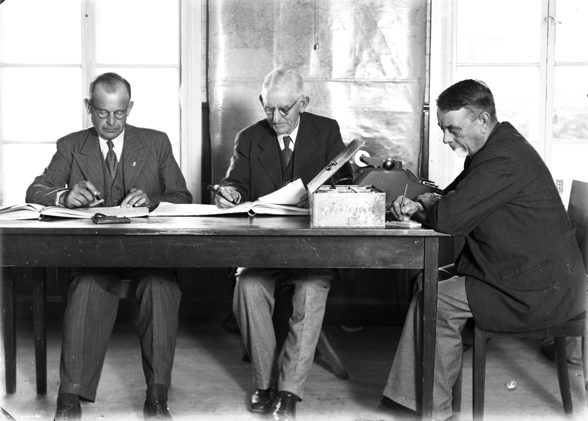 Fattigvårdsstyrelsens ordförande Per Wiberg, kommunalnämndens ordförande Johan Lindblom och kommunalfullmäktiges ordförande Albin Thunman. Ev skatteuppbörd i början av 1930-talet.