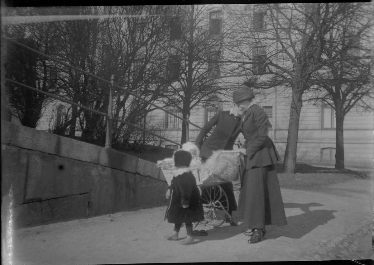 Här är Elna Brundin ute på en vårlig promenad med Sören i vagnen och Eva framför. Bilden tagen ca 1923, på våren. Huset i bakgrunden är troligen västra gaveln på Grand Hotel och till vänster ovanför staketet ligger Frimurarhuset.