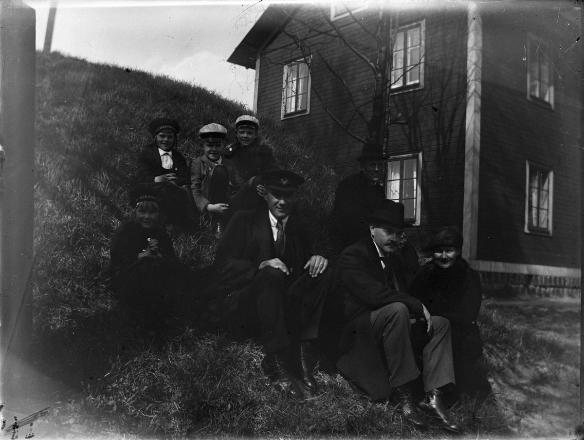 En bild från Holmsveden. Längst fram sitter Elis Öhrn med hustru Selma, goda vänner till familjen Brundin. Till vänster om paret sitter David Brundin i chaufförsmössa och till vänster om honom Karin. Bakom sitter Ingrid och paret Örhns barn, Simon och Gunhild. Elis Öhrn var chef för Holmsvedens handelsbolag.