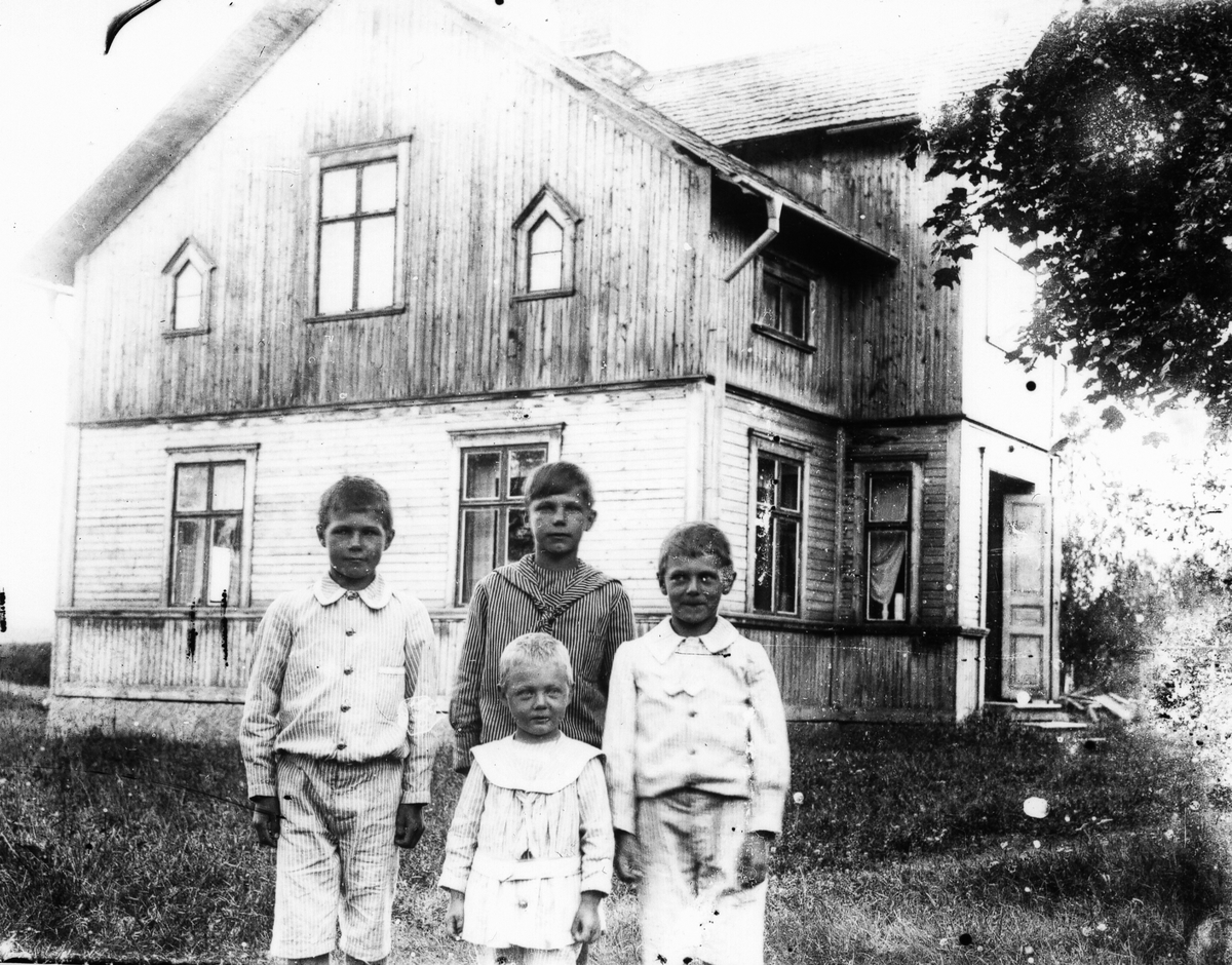 Fyra barn samlade framför ett hus.
