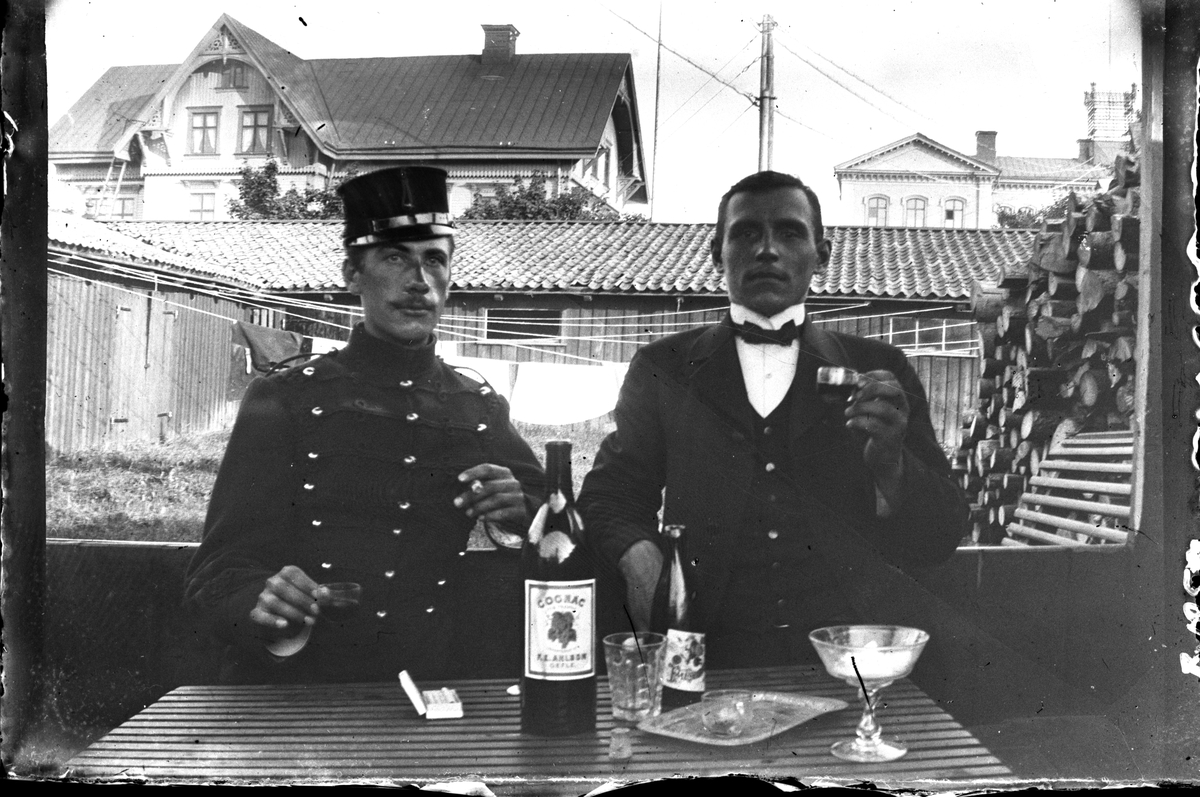 Två herrar drickande konjak. På söder med Islandsskolan t h bakom.