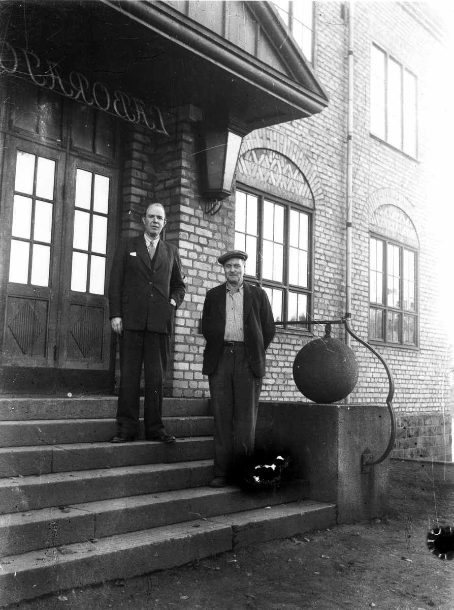 Maskinmästare Hellström till höger och ingenjör Arnold Andersson på laboratoriets trappa. Foto i oktober 1950 (kortet bakvänt).
