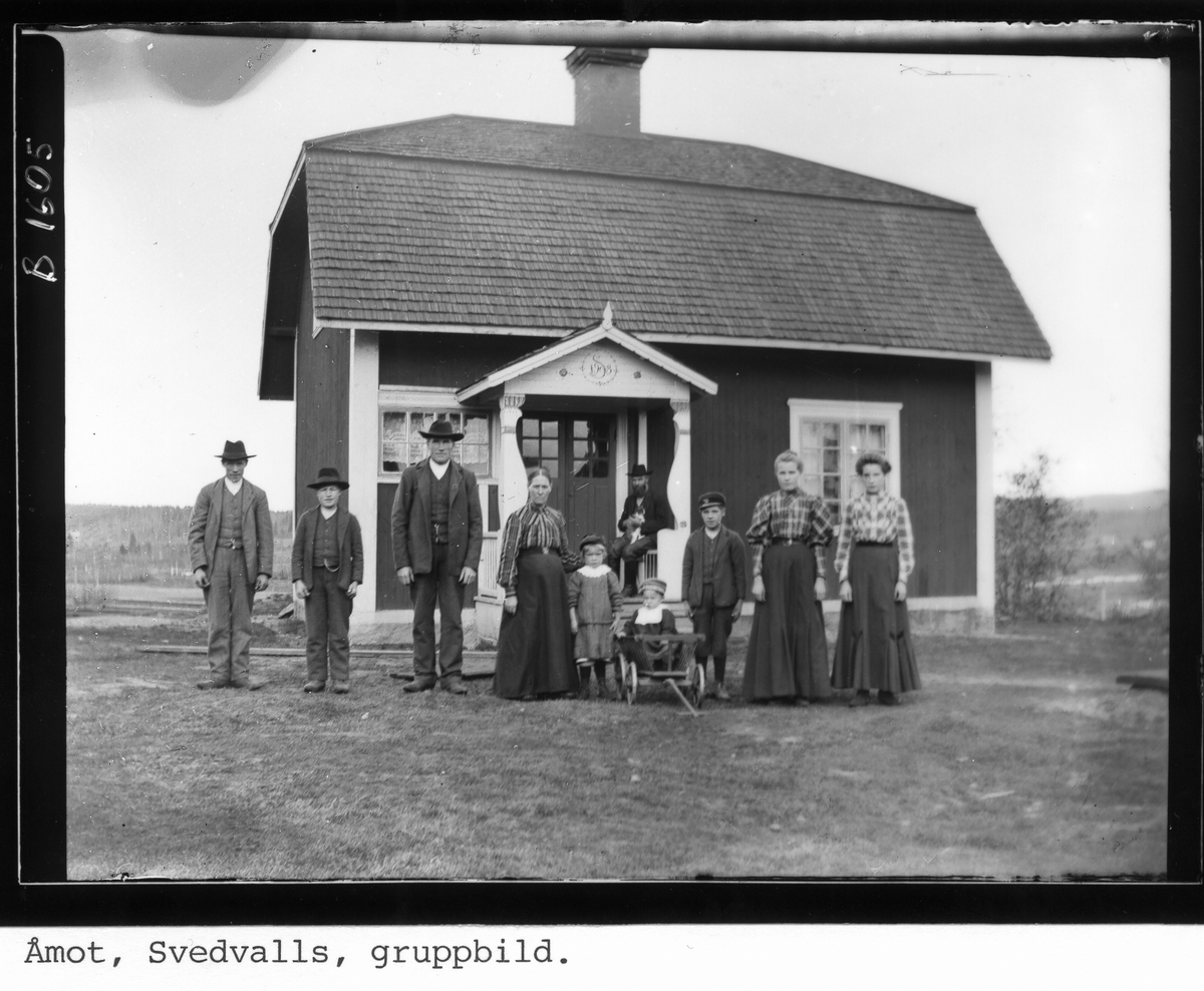 Åmot, Svedvalls i Byn. Från vänster: Johan, Manne, Olov och Anna-Britta, Signe, Erik (i vagnen), August, Anna (Åker-Anna) och Johanna (Ol-Jöns).
