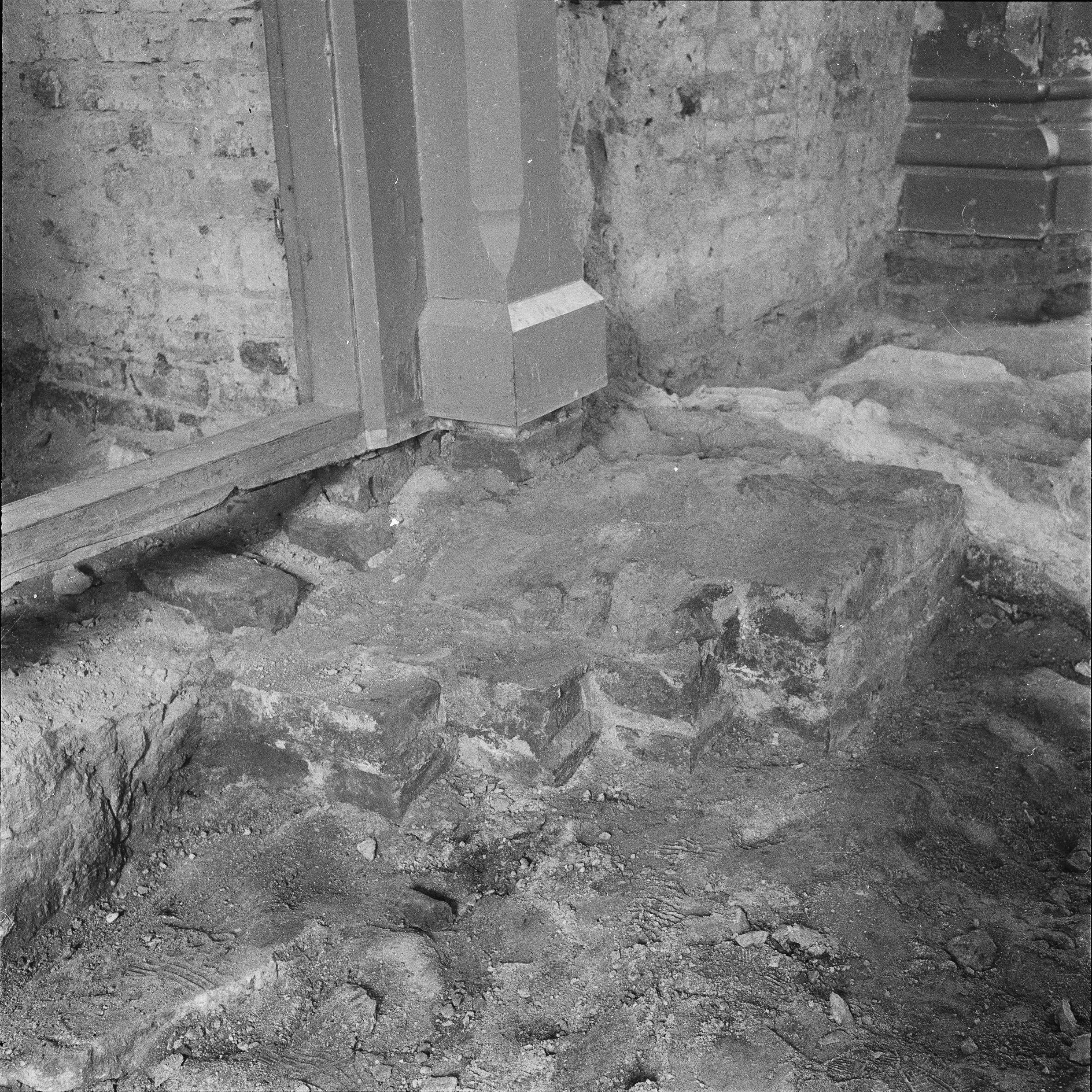 Kyrkan under ombyggnad. Långhusets pilasterbas mot nordväst.