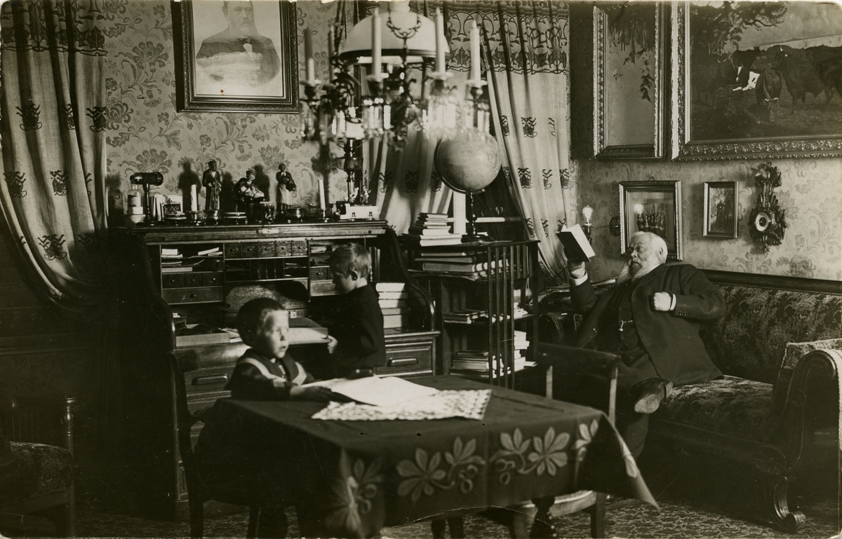 Familjen Westerlund samlad i "Stora rummet" i Jädraås herrgård. Från vänster sonen Adolf (1907-2002), sonen Alfred (1905-1979), trafikchefen för DONJ (Dala-Ockelbo-Norrsundets järnväg) August Westerlund (1853-1920).