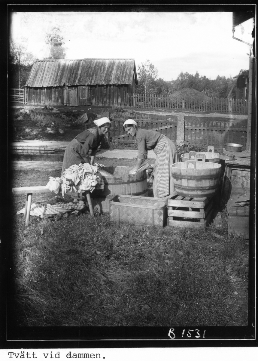 Tvätt vid dammen. Till vänster Hanna Hansson ("By-Hanna") och till höger Betty från Heden.