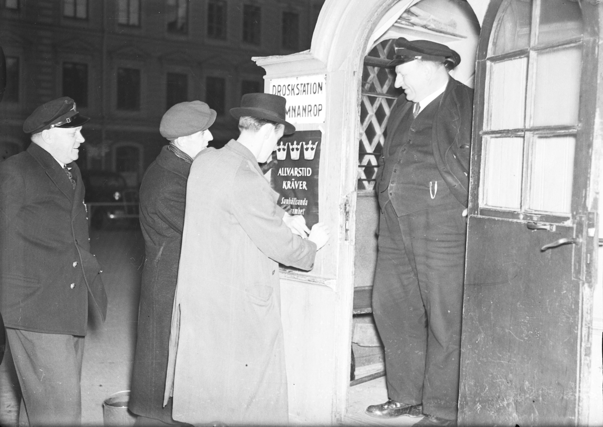 Droskstationen på Rådhustorget. "Allvarstid kräver samhällsanda, vaksamhet, tystnad". "Varen svens, visa besinning...vår beredskap är god" manade Per Albin Hansson. Uppmaningar sattes upp på olika ställen i Gävle, här vid droskstationen.
