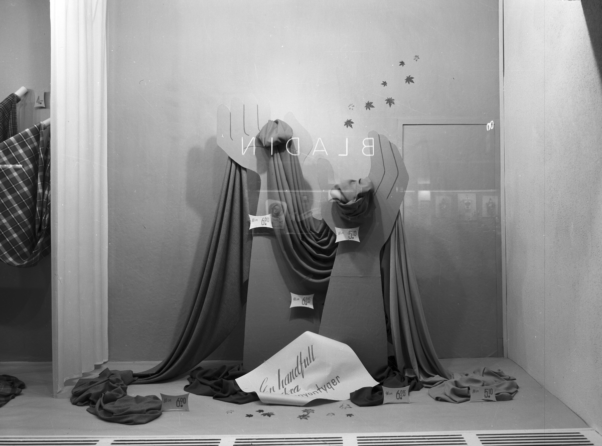 Konsum Alfa Varuhuset. Skyltfönstertema "En handfull tyger". Den 26 september 1949