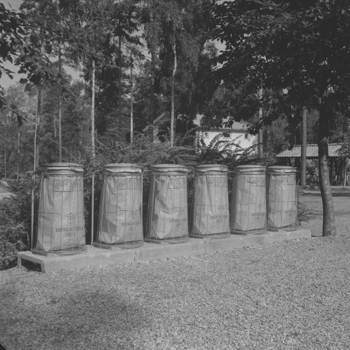 Sex soptunnor med sopsäckar från Korsnäs AB. Den 8 juni 1961