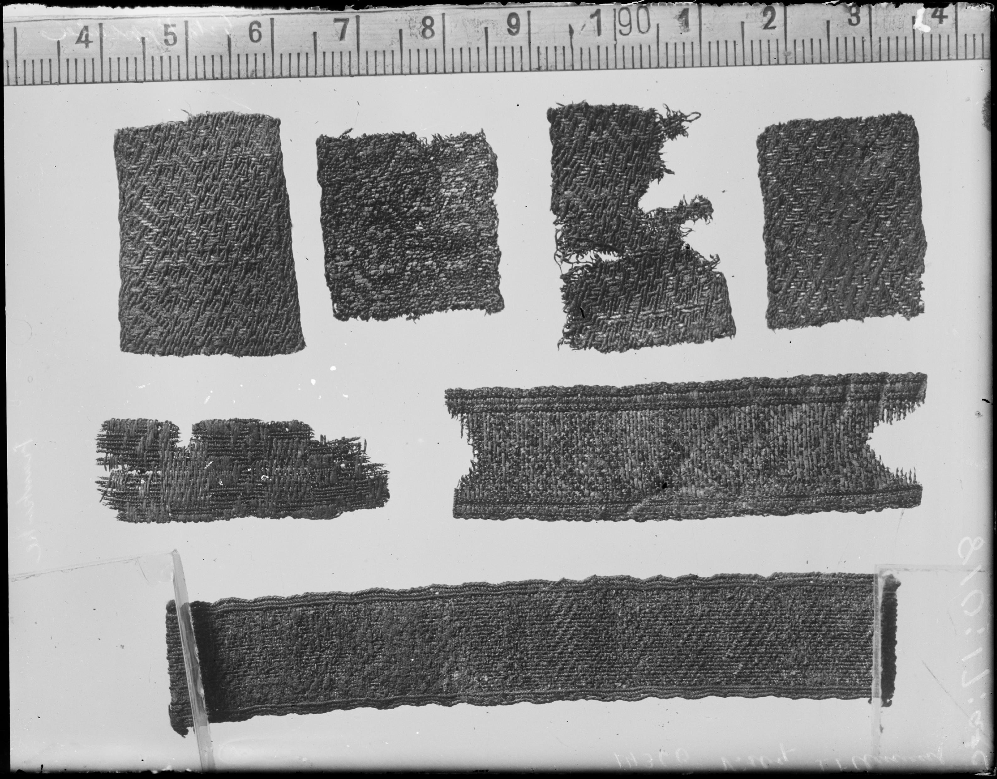 Små bandbitar av silke och guldtråd, fyra stycken. Fynd från Biskopsgraven. (Förstoring). 1200-talet. Se Fornvännen 1928.