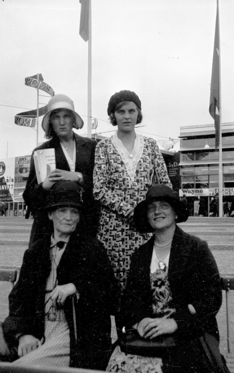 En bild från Stockholmsutställningen 1930. Stående Karin och Ingrid Brundin framför deras moster Gertrud Nordgren till höger och mormodern Anna Larsdotter Olsson till vänster.