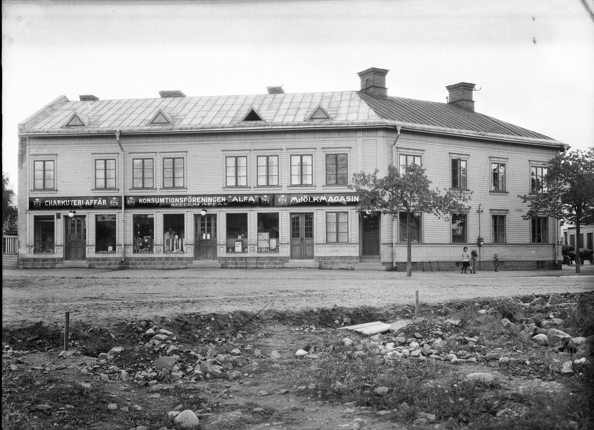 Konsum Alfa i Gävle. Affären låg på Eriksbergsgatan, mellan 5:e och 6:e Tvärgatan. Senare byggdes det till en mjölkbutik i den högra delen som hade adress Kaserngatan.