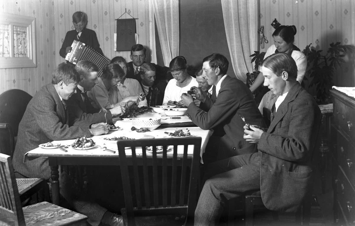 Kräftkalas. Mannen till vänster om fönstret Enok Eriksson.