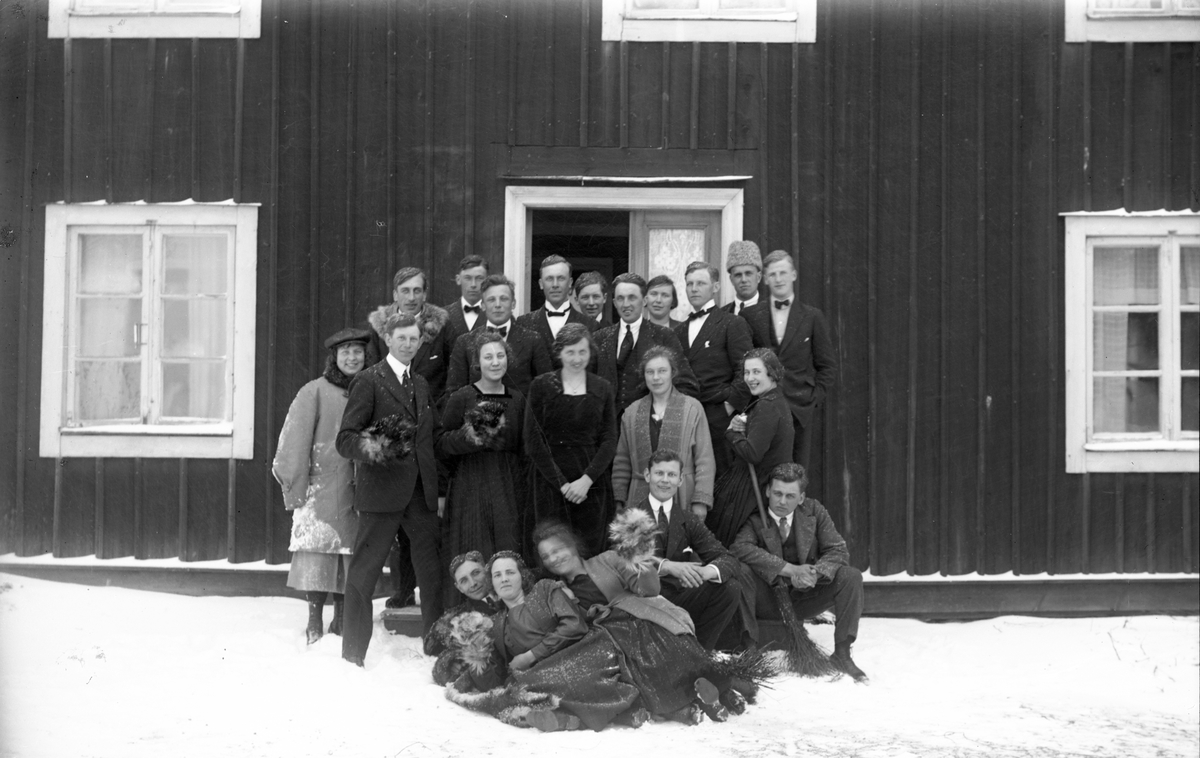 Ungdomsgäng vi "Erik-Larsgården", Wästra Hästbo. Einar Larsson, Åsmundshyttan till höger i pälsmössa längst bak. Enok Eriksson, Åsmundshyttan sittandes till höger med sopkvasten.