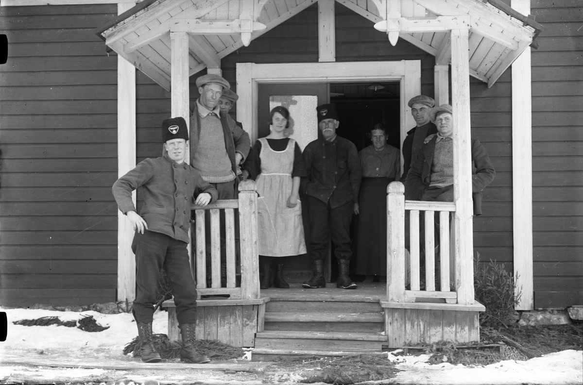 Grupp på trappan till järnvägsstationen i Dalaåsbo, Stjärnsund, Hedemora.