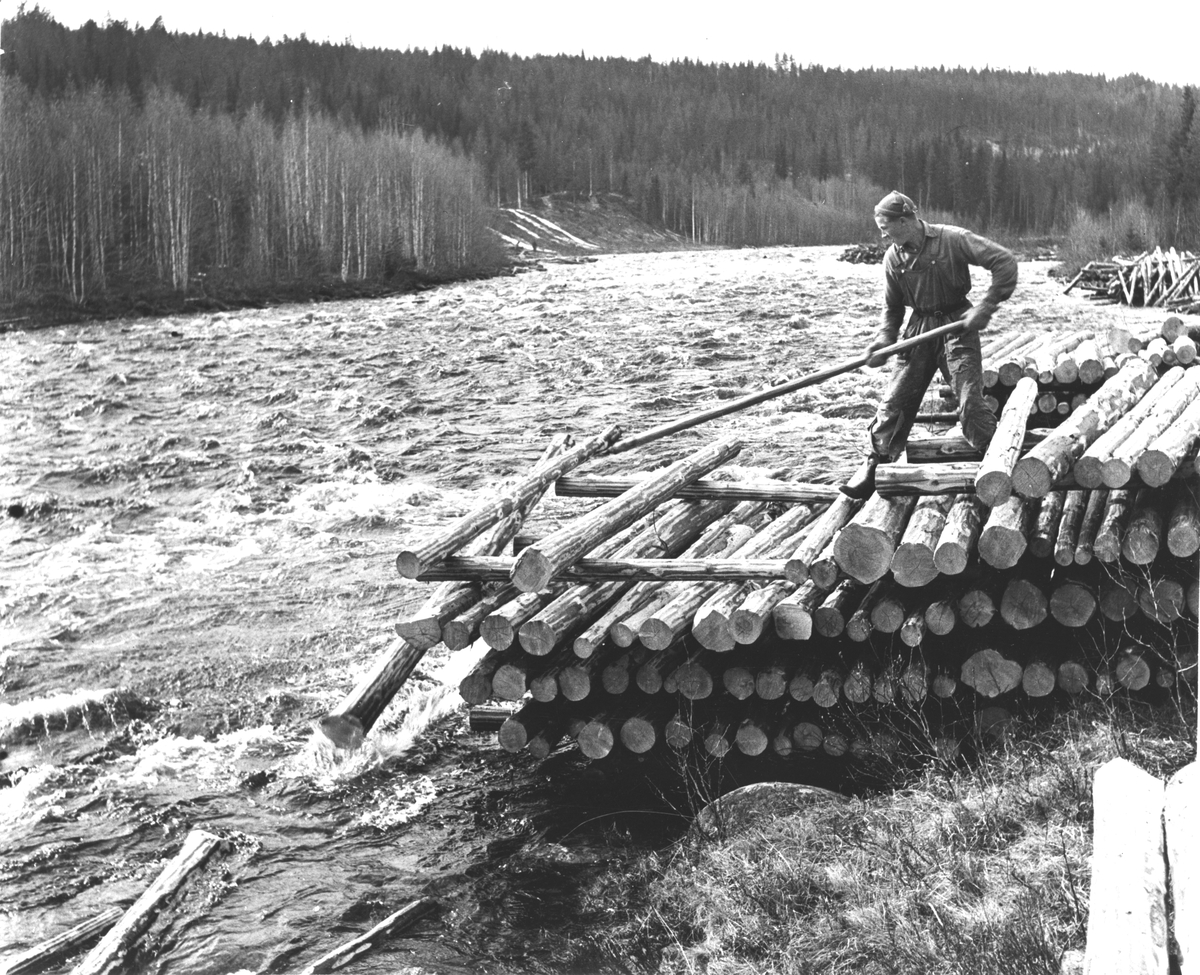 Flottningsarbetarna hjälper till att få timmer och massaveden ned i vattendragen. Den 9 juni 1950. Korsnäs AB är ett av Sveriges ledande skogsindustriföretag som tillverkar kartong, säck- och kraftpapper, fluffmassa till hygienprodukter och sågade trävaror.