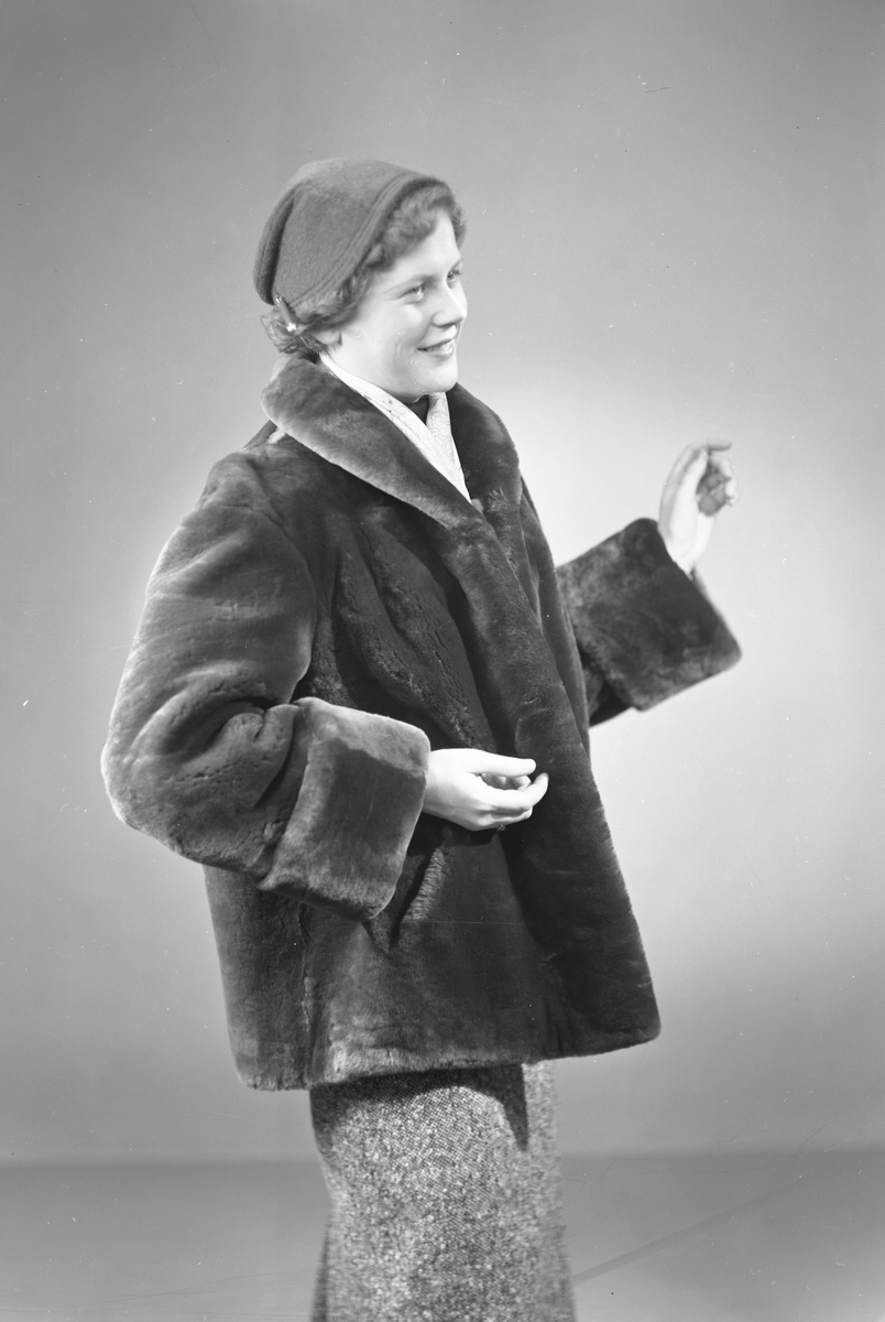 Titel: Pälsjacka. L. Haglund & Co, med varumärket Elhå. Grundades som en affär för mössor, hattar och pälsvaror av Lars Haglund 1872.