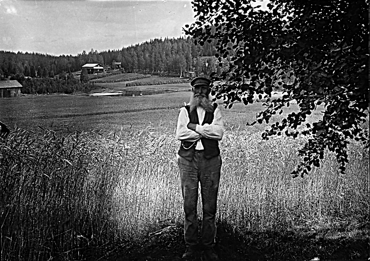 Bergsänge i Herte. "Lars-Pers" boställe i bakgrunden. Mannen okänd, men han kom ev från Dalarna.