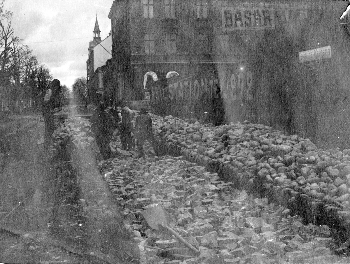 Arbeten på Nygatan/Hattmakargatan. På tomten bakom planket byggdes senare Post- och Telegrafhuset.
