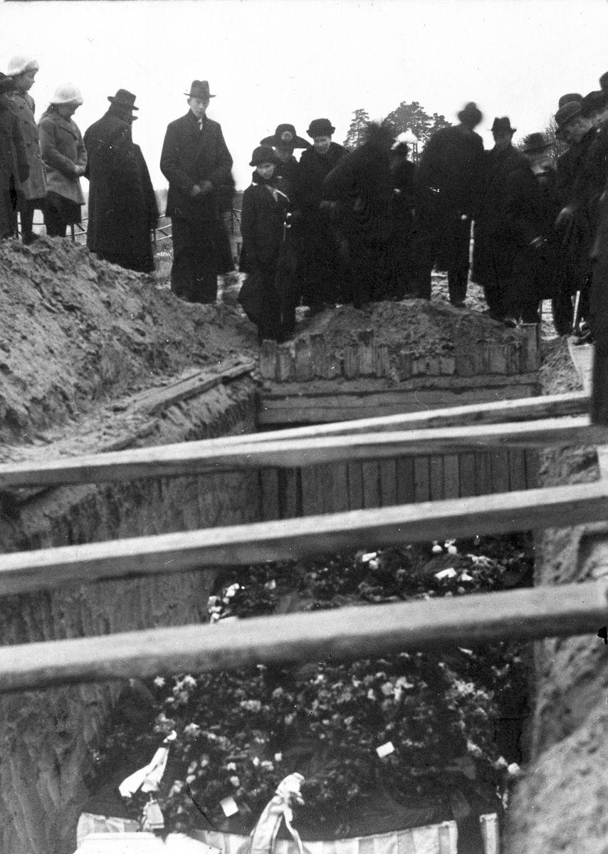 15 personer begravs vid kyrkogården i Ockelbo, som offer för Spanska sjukan. Sörjande framför graven.