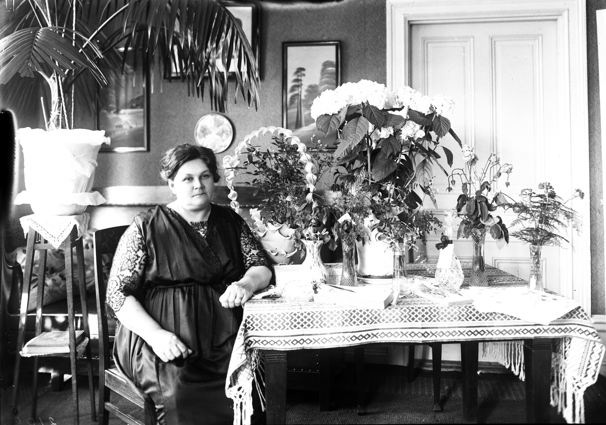 Kvinna sittande vid bord med blommor.